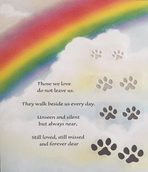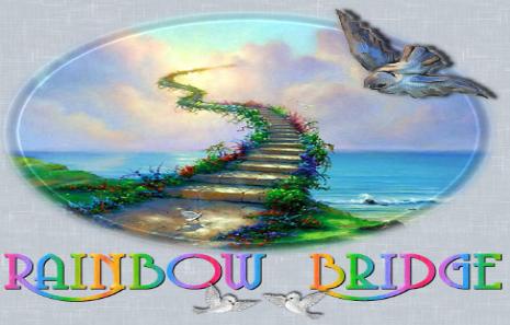 | The Rainbow Bridge Just this side of heaven is a place called The Rainbow Bridge. When a beloved pet dies who has been especially close to someone here, that pet goes to The Rainbow Bridge...... It is a land of meadows, hills and valleys with lush green grass. There is always plenty of food and water and sunshine; Our friends are warm and comfortable. Those old and frail animals are young again, restored to health and vigor. Those who have been hurt or maimed are made whole and strong again. The animals play all day; They are happy and content with each other. But, there is only one thing missing. They are not with their special person who loved them on earth; the one who had to be left behind. Then, the day comes when one suddenly stops and looks into the distance. Their bright eyes are intent; the eager body quivers. Suddenly one breaks away from the group, Flying over the green grass; their legs carrying them faster and faster, You have been seen, And when you and your special friend meet, you take them in your arms and embrace. The happy kisses rain upon your face, Your hands again caress the beloved head, You look once more into the trusting eyes of your pet. And then, together, you cross The Rainbow Bridge........ Never to be separated again. |